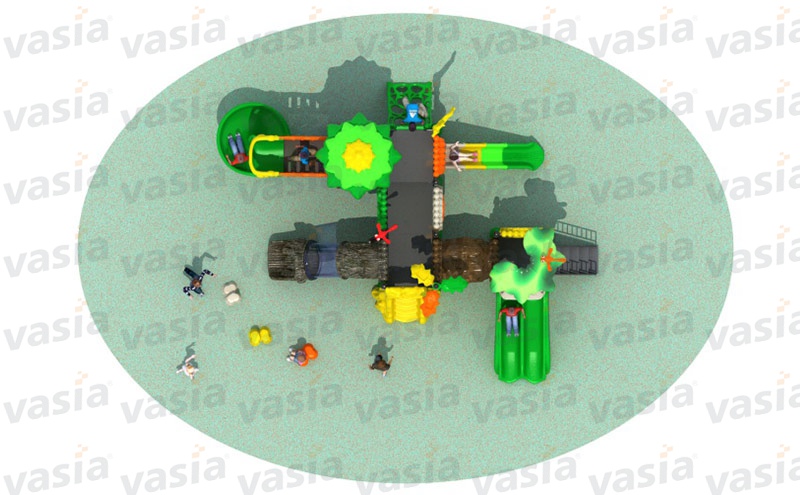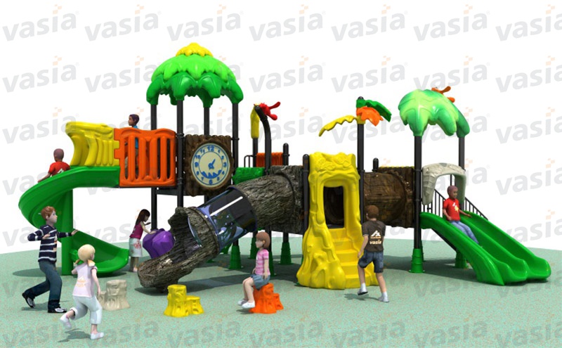 The commercial outdoor play equipment depicted is perfectly tailored for daycares, offering a vibrant and engaging environment for young children. This multi-structured playground features a variety of components, including slides in bright red and green, climbing structures, and interactive panels in vivid colors like orange, purple, and blue. Designed to stimulate physical activity and imaginative play, the equipment encourages children to develop their motor skills, coordination, and social interaction. The inclusion of palm tree decorations adds a playful, tropical touch, enhancing the overall appeal. Safe and durable, this play set ensures hours of fun while meeting the needs of daycare settings for reliable and entertaining outdoor activities.